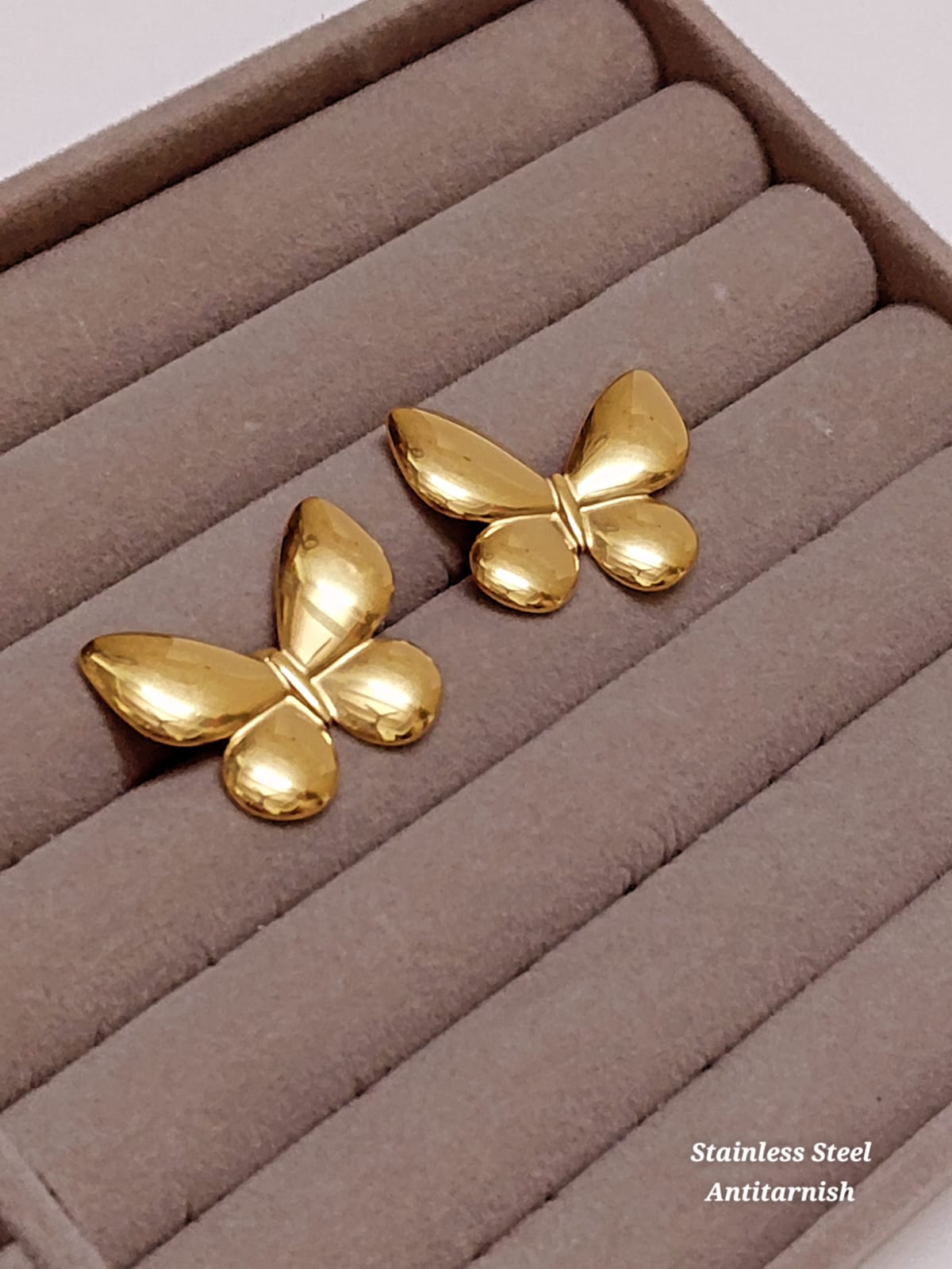 Cute butterfly gold stud earrings made with anti-tarnish stainless steel. Lightweight, elegant, and perfect for everyday wear.